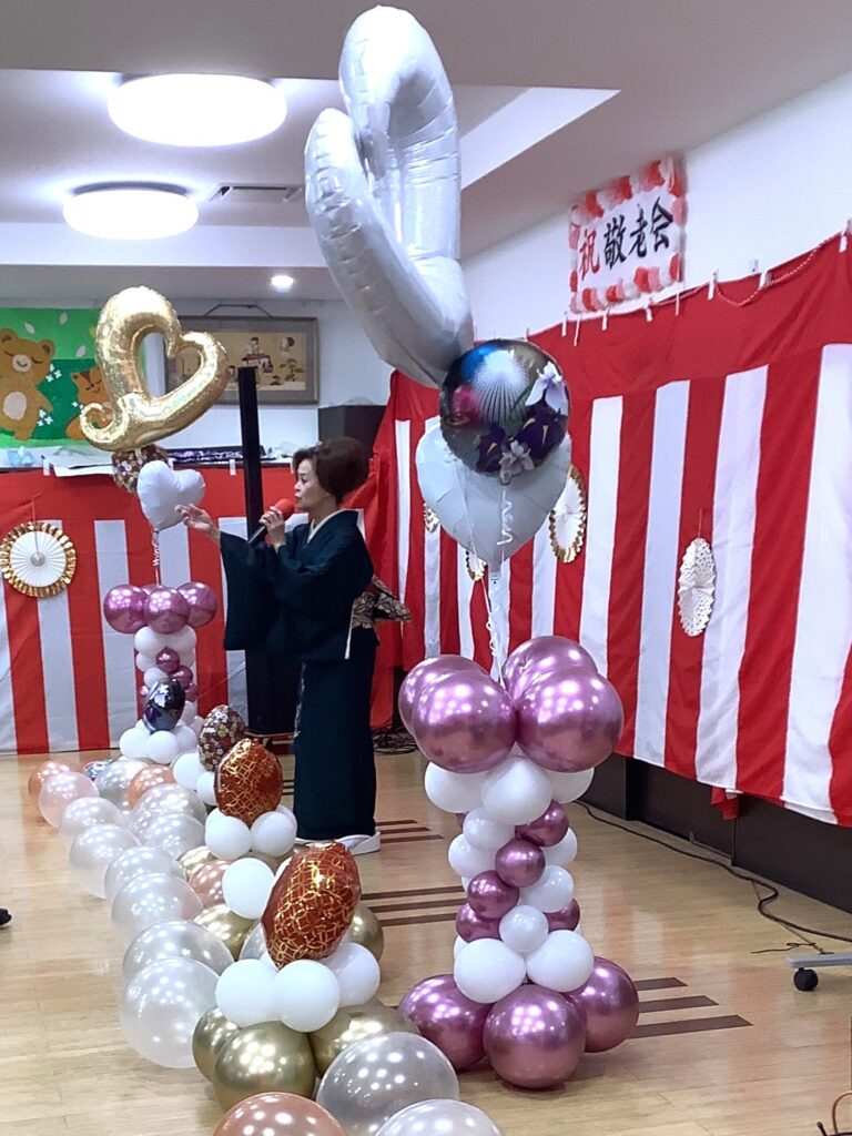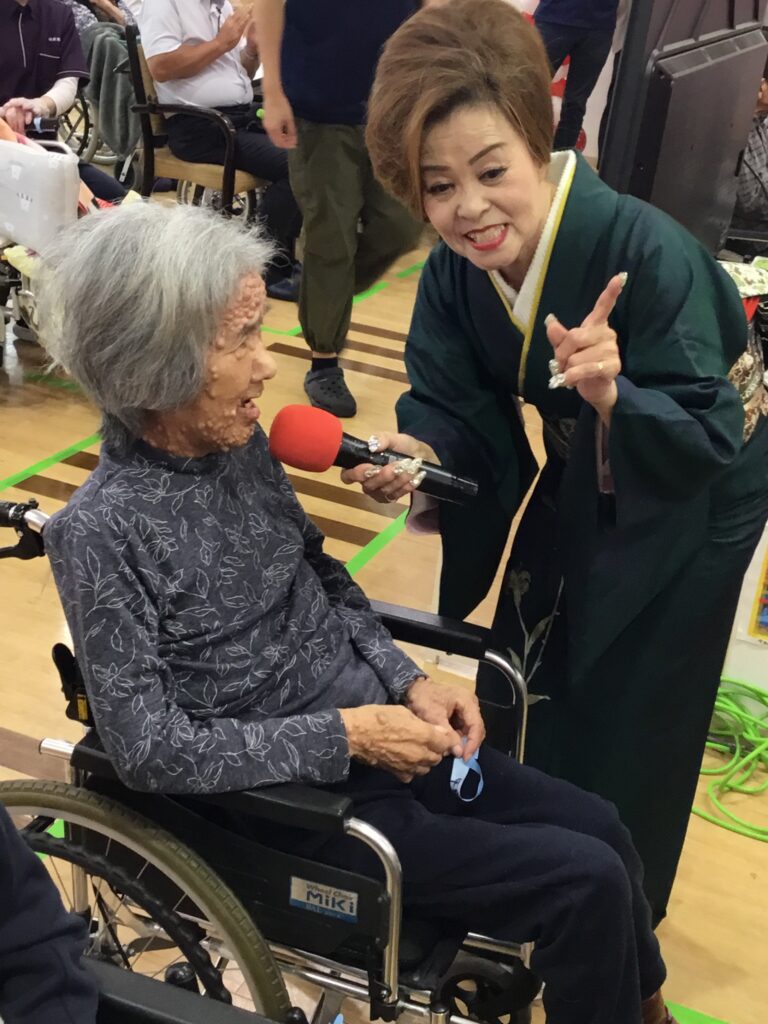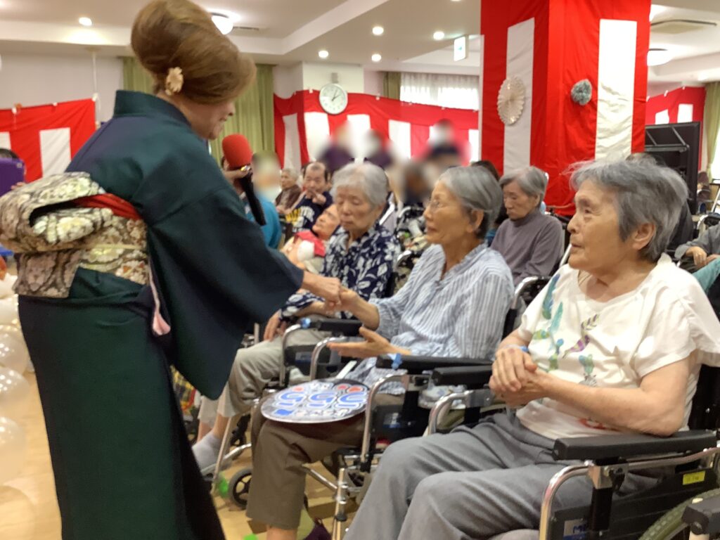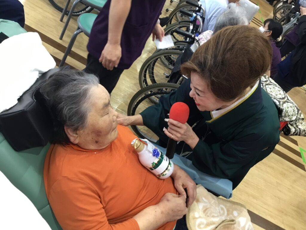 ・9月に敬老会をおこないました。今年も演歌歌手の晴香うららさんをお招きし、たくさんの名曲を聴かせていただきました。90歳、99歳、100歳以上の入所者様には長寿のお祝いのプレゼントをお渡しし、全員参加のくじ引きでは空気清浄機やジュース詰め合わせなどの豪華賞品を準備しました。昼食には穴子のちらし寿司、天ぷら、赤だし、シャインマスカットをお出ししました。