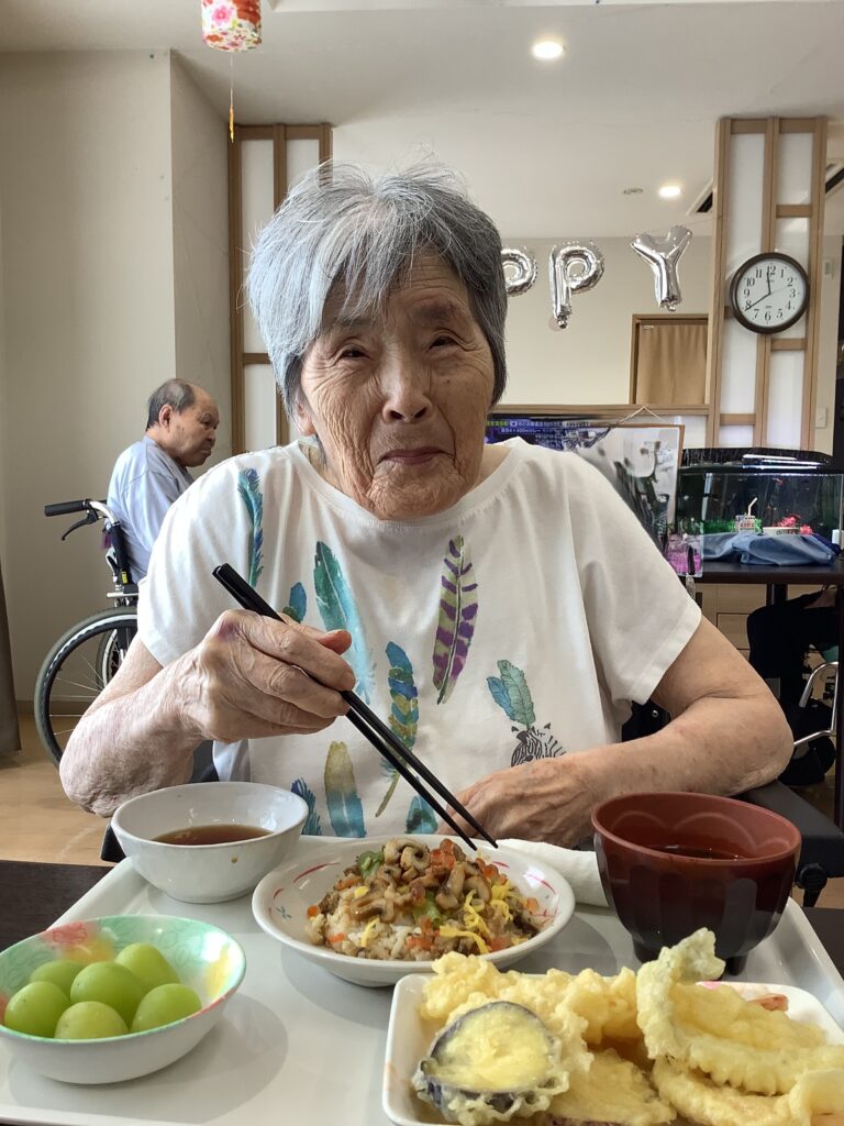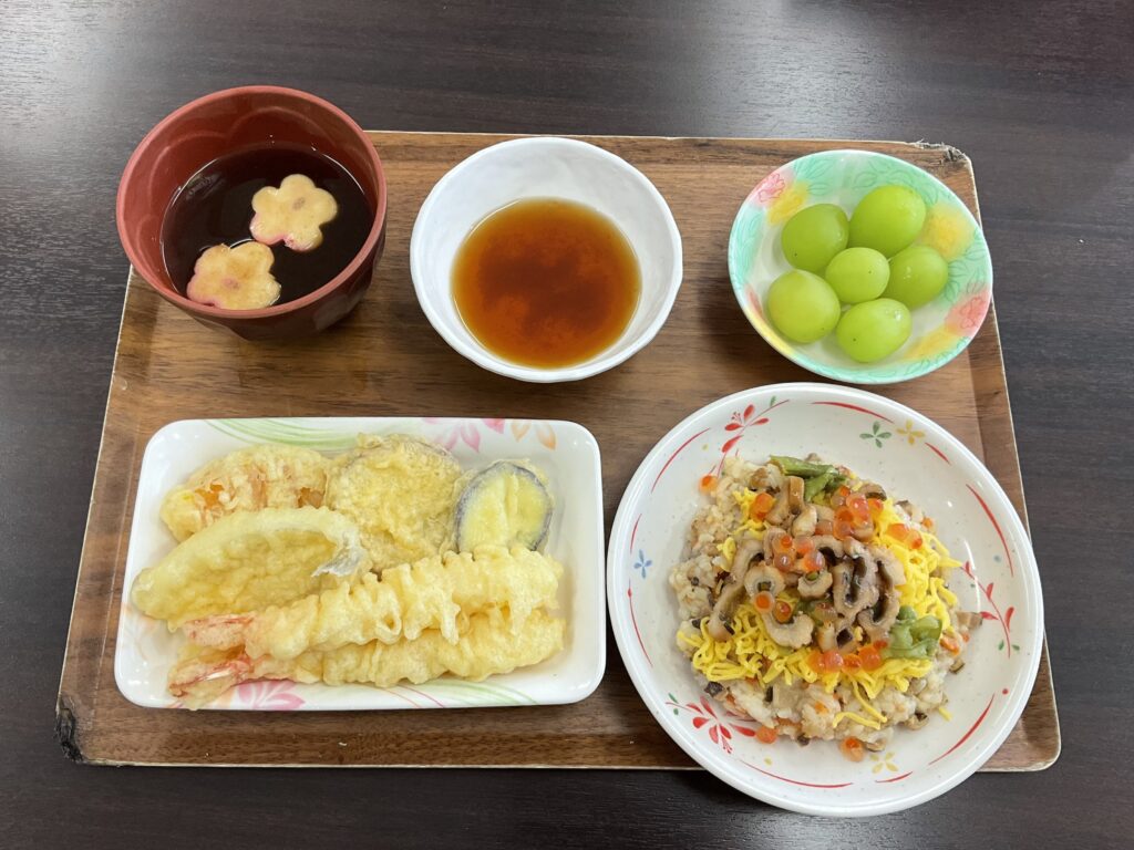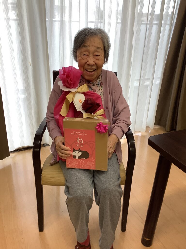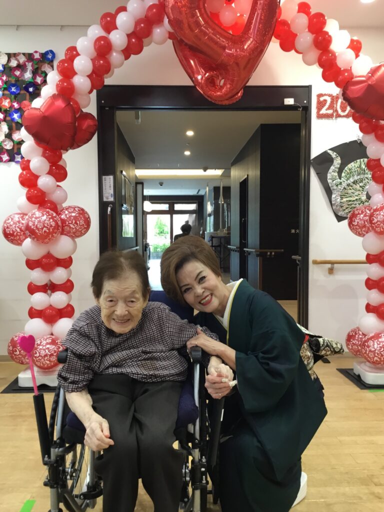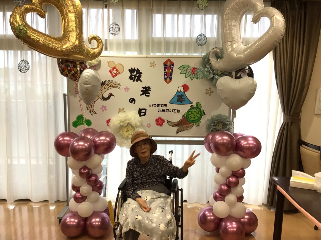 ・9月に敬老会をおこないました。今年も演歌歌手の晴香うららさんをお招きし、たくさんの名曲を聴かせていただきました。90歳、99歳、100歳以上の入所者様には長寿のお祝いのプレゼントをお渡しし、全員参加のくじ引きでは空気清浄機やジュース詰め合わせなどの豪華賞品を準備しました。昼食には穴子のちらし寿司、天ぷら、赤だし、シャインマスカットをお出ししました。