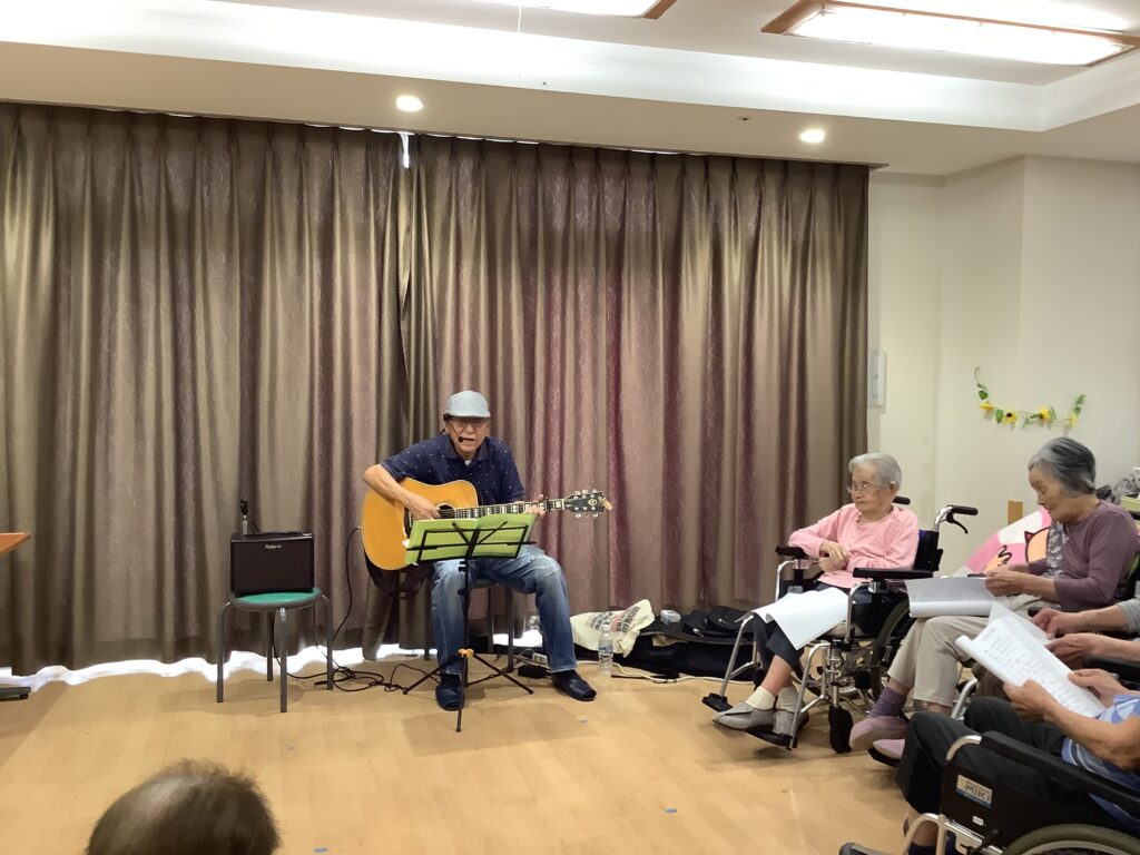 ・毎月、ギター演奏のボランティアの方に来ていただいています。昭和の名曲の弾き語りを聞きながら、一緒に口ずさんだり手拍子をしたりマラカスを振ったりしながら楽しまれています。